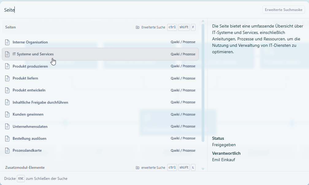Fazit: Die neue Suchfunktion in Q.wiki verbessert die Nutzererfahrung und macht das Managementsystem noch interaktiver, indem sie euch ermöglicht, Informationen schneller und einfacher zu finden und so die Zusammenarbeit und Effizienz im Team zu steigern.