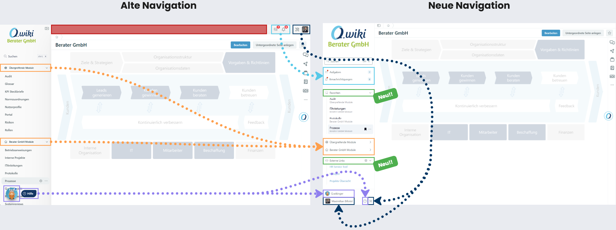 - Lila: Der Q.wikinger und unser Help Bereich sind nun ebenfalls in die Navigationsleiste integriert und verdecken keine Bereiche von Q.wiki mehr, weil sie davor schweben.